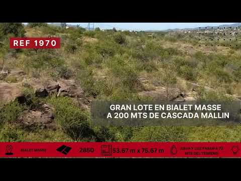 <p><span style="font-weight: bold;"> CECILIA INMUEBLES OFRECE:</span></p><p><span style="font-weight: bold;">GRAN LOTE EN BIALET MASSE A 100 m DEL RIO A 200 DE LAS CASCADAS MALLIN REF : 1970</span></p><p> Hermoso lote ubicado en Bialet Massé, Barrio Mirador del Lago a 400 ms de la avenida Cassafousth por donde pasa colectivo, 2 km aprox de la bajada de autovía y 4k m aprox de ruta N 38 ubicado en entorno rodeado de paz y naturaleza, ideal para realizar una casa quinta o complejo de cabañas. <br><br>En los primeros 20 ms desde la vereda es mínimo el desnivel, a posterior empieza un poco más pronunciada el desnivel en la parte derecha del terreno y del lado izquierda cuenta con una piedra en forma de huevo que se una con las piedras enormes que tiene el lote colindante. <br><br>El lote se encuentra alambrado en la parte trasera 4 hilos y en sus dos laterales cuenta con pilar de la luz. <br><br><span style="font-weight: bold;">SUP: 2850.42</span></p><p><span style="font-weight: bold;"> </span><br><span style="font-weight: bold;">Luz y agua se encuentra a 70 ms aprox</span></p>